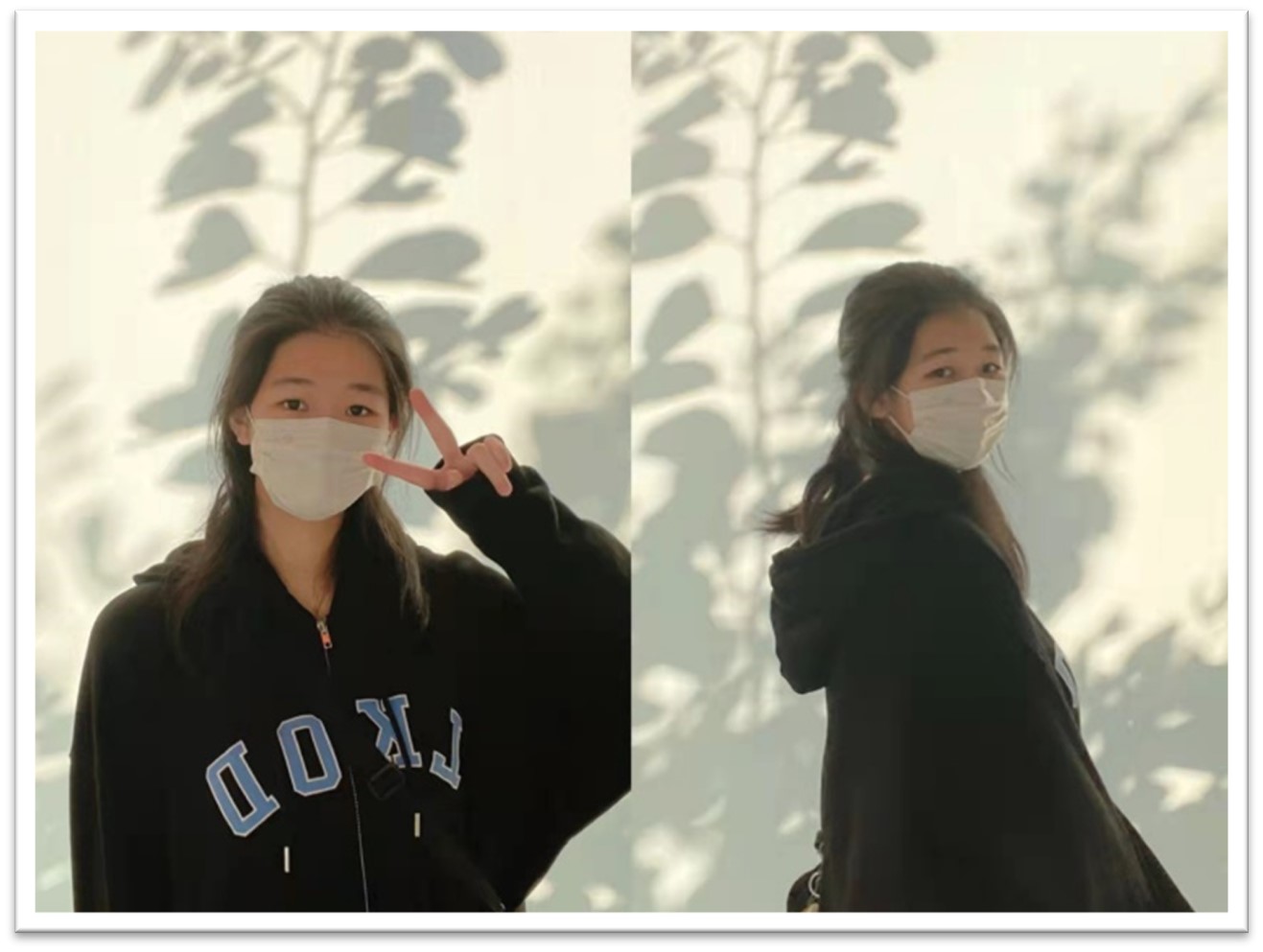 I come from Hong Kong. The photos on the left my sister took of me when we went for breakfast one morning. We saw the background of the shadow view; it was very beautiful, so she took the photos of me. My sister loves taking photos.